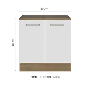 O móvel acompanha ainda tampo resistente em MDP e os pés são reguláveis em PVC, com rodapé removível para facilitar a limpeza.