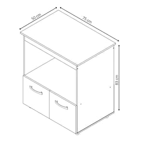 Medidas: 85,5 cm (A com pés) x 75 cm (L) x 50 cm (P). Os pés têm 5 cm de altura, são fixos e feitos em plástico resistente. Possui puxadores cromados e acabamento elegante que se adapta a diversos estilos de cozinha.