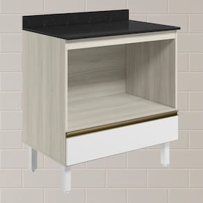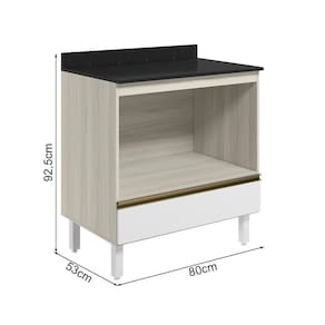Balcão Nicho para Forno com Tampo, funcional e compacto para composições modernas. Com 80cm de largura, fabricado 100% em MDF, possui estrutura de 15mm, com forro de 3mm. Conta com 1 nicho interno para forno com 77x42,9cm e uma gaveta com corrediças telescópicas. Os 4 pés possuem altura de 15,5cm com regulagem adicional de 1,5cm, garantindo estabilidade em qualquer piso. Este móvel chegará em sua casa separado em 3 volumes.