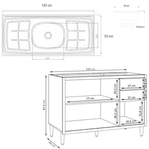 Dimensões do Balcão: Altura: 82,6 cm Largura: 120 cm Profundidade: 53,8 cm Dimensões da Pia e Cuba: Altura: 13,5 cm Largura: 120 cm Profundidade: 53 cm