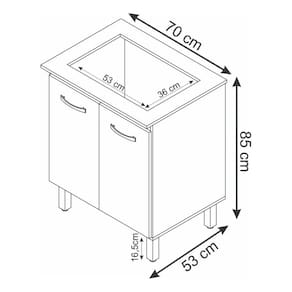 Dimensões Altura: 83 cm Com os pés Altura sem os pés: 68,5 cm Largura: 70 cm Profundidade: 53 cm Dimensões do Nicho (Recorte para encaixar o cooktop): 53 x 36 cm
