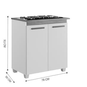 Balcão para CookTop de 4 bocas Fox é um produto compacto que pode ser utilizado como complemento de cozinha ou peça única, possui amplo espaço interno para melhor armazenar os seus utensílios. Com suas duas portas e prateleiras internas ele te ajudará a deixar sua cozinha mais organizada e bonita.\nIDEAL PARA COOKTOP DE 4 BOCAS\nEspecificações: Altura: 93 cm Largura: 78 cm Profundidade: 50 cm Dimensões do corte: 53,5 x 35,0 Peso: 28 Kg Quantidade de Volume: 1\nGarantia: 3 meses Material da estrutura: MDF 15mm Acabamento: Pintura U.V. Número de Portas: 02 Número de Prateleiras: 02\nObservações: Não oferecemos serviço de montagem, mas todos os produtos possuem manual de montagem com o passo a passo. Recomendamos contratar um profissional de montagem. Pode existir alguma diferença de tonalidade entre a foto e o produto, devido ao tratamento de imagens e à calibração de cores do monitor