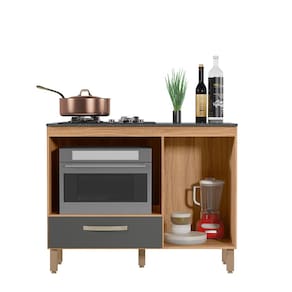 Características: Estrutura em MDP Pintura UV Tampo com recorte para cooktop 04 bocas Nicho para forno elétrico ou micro-ondas 01 Porta com dobradiças metálicas 01 Gaveta com corrediças metálicas Puxadores em Polietileno Pés com regulagem de altura NÃO ACOMPANHA COOKTOP.