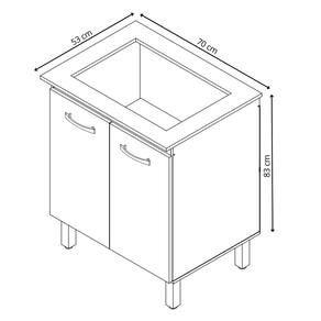 Fabricado em MDP, o corpo do balcão garante durabilidade e resistência. Com dimensões de 70 cm de largura, 53 cm de profundidade e 84 cm de altura, ele se adapta facilmente a diferentes espaços, otimizando a área da sua cozinha.