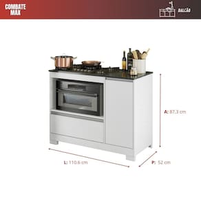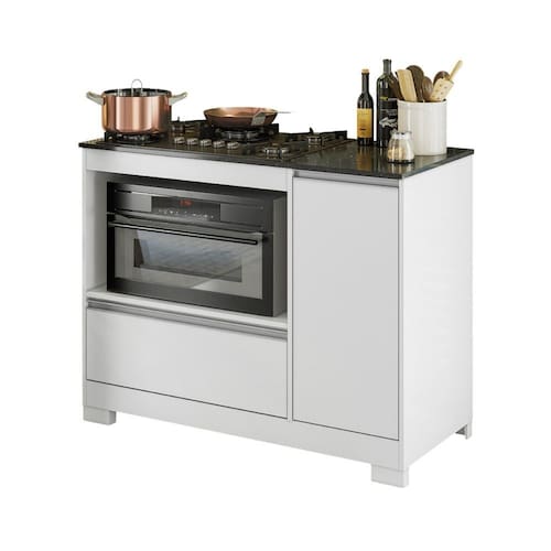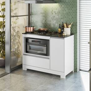 Design Moderno: Visual clean que valoriza a cozinha. Tampo para Cooktop: com modelos de 4 e 5 bocas. Gavetao Espacoso: Com corredicas telescopicas para maior conforto no uso. Porta com Prateleira Interna: Organizacao pratica para utensilios. Espaco para Micro-ondas: Acesso facil e otimizacao do espaco.