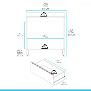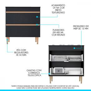 Características: Produzida em MDP de 15 mm Acabamento UV Texturizado Gavetas com Corrediça Telescópica Puxador Perfil em ABS Pés Regulares em ABS Tampo suporta 10 Kg e Gavetas suportam 3 Kg Tampo possui ranhura para recortar e utilizar com cooktop de até 5 bocas, caso não cortar pode ser utilizado normalmente como balcão.