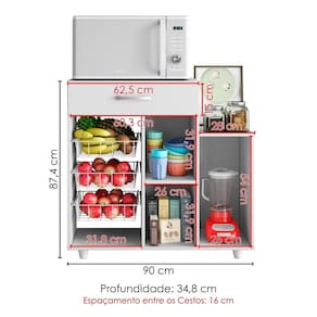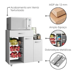Fruteira prática e moderna. Harmoniza com a decoração ambiente enquanto organiza perfeitamente com seu amplo espaço interno. Conta com estrutura em MDP de 12mm com acabamento em verniz texturizado. Dobradiças e corrediças metálicas, gaveta ampla (suporta até 3kg), puxadores de plástico, prateleira externa e interna (suportam entre 3 a 5 kg cada) e cestos laterais aramados em metal (suportam até 3 kg cada). Este produto será entregue em 1 volume.