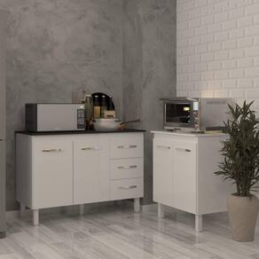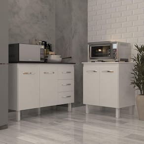 Balcão Para Microondas Ou Forno Branco E Armário Bruna 118 Cm Cozinha Gabinete Branco Com Tampo Tampão Preto Transforme sua cozinha com este Kit, que une funcionalidade e design! Inclui um balcão Bruna de 120 cm com tampo, perfeito para preparo de alimentos e refeições, e um balcão Jane para forno ou microondas, projetado para instalação segura e organizada. Com materiais de alta durabilidade e acabamento sofisticado, este kit é ideal para quem busca otimizar o espaço com estilo. Modernize sua cozinha com um produto que combina praticidade, qualidade e design! Garanta já o seu e aproveite a comodidade que sua cozinha merece! Características do Balcão: