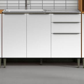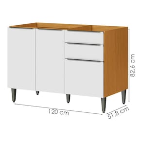 Balcão para pia 2006807, design moderno e funcional para completar sua cozinha. Estrutura em MDF (15/12 mm) com acabamento em Verniz. Possui portas com dobradiças metálicas, gavetas com corrediças telescópicas, puxadores em plástico, prateleira interna e pés em plástico de 15 cm (regulagem de 3 cm). Tampo não incluso (não acompanha pia) Este produto será entregue em 1 volume.