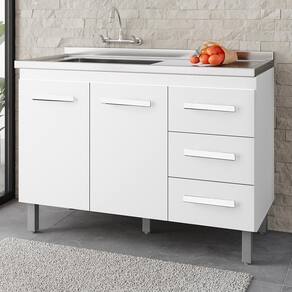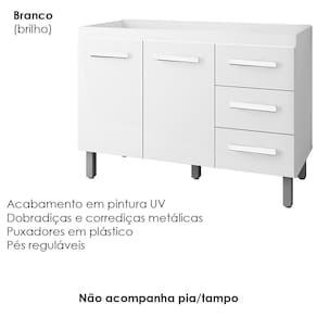 Balcão Para Pia Bianca, organização e praticidade para o seu dia a dia. Produzido em MDP (12/15 mm), com acabamento em pintura UV. Possui portas e gavetas equipadas com dobradiças e corrediças metálicas, prateleira interna, pés reguláveis e puxadores em plástico. NÃO ACOMPANHA PIA/TAMPO. Este produto será entregue em 01 volume.