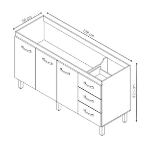 Suas medidas são: 83,5 cm de altura (com pés), 138 cm de largura e 50 cm de profundidade, ideal para pias de 140 cm. Os 6 pés plásticos com regulagem de até 18 cm facilitam o nivelamento em diferentes tipos de piso, proporcionando mais estabilidade e conforto no uso.