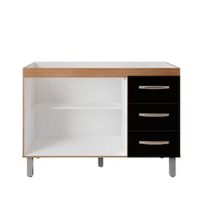 Balcão Para Pia De Cozinha Bianca Com 2 Portas e 3 Gavetas Cor Savana/Preto Moblis O Balcão Para Pia Bianca é o produto ideal para quem procura praticidade e beleza, é um produto versátil, possui amplo espaço interno bem distribuído em 02 portas de bater, 03 gavetas com corrediças metálicas, puxadores em plástico cromado.