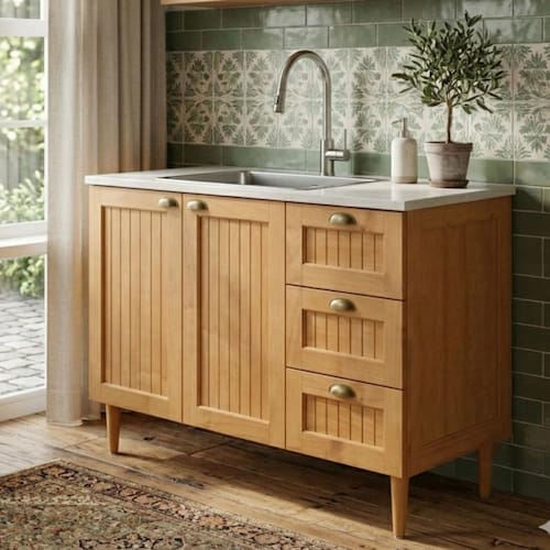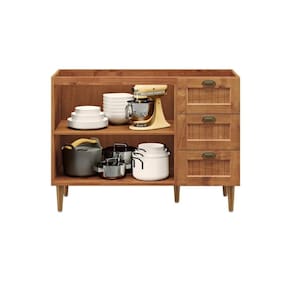 Balcão com estrutura em Madeira de Pinus Reflorestada, acabamento feito em Poliuretano (PU) FOSCO, que preserva as caracteristicas da madeira e garante uma ótima conservação e durabilidade do produto. Possui gavetas com corrediças telescópicas e prateleira de compensado 15mm que proporsiona espaço e resistência. Puxador e pés em ABS na cor Champagne.