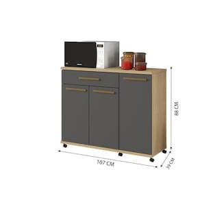 Balcão Parati 3 Portas 2 Prateleiras 1 Gaveta Arte Moveis Cinamomo/grafite Prático e funcional este balcão multiuso foi projetado para usar em diversos ambientes e funcionalidades , organize a sua cozinha, área de , etc. Com comodidade utilizando o mais prático balcão da categoria, com ampla gaveta com corrediça metálica, 03 portas com prateleiras internas e ainda possui rodízios para facilitar na locomoção. Não perca tempo para embelezar ainda mais seu ambiente com este produto versátil. Informações técnicas Acabamento Pintura UV Acabamento Interno Branco Fosco Altura 88 cm Ambiente Principal Cozinha Complexidade da Montagem Média: Pode ser montada por pessoa com conhecimento técnico Cor Branco Escala de Brilho Semi Brilho Estilo Clássico Gaveta com Chave Não Largura 107 cm Material MDF/MDP Material do Tampo MDF Pés Reguláveis Não Peso do Produto 37,00 Kg Peso por Prateleira 5 Kg Possui Gaveta 01 Possui Pés 05 Possui Prateleiras 02 Possui Rodízio Sim Profundidade 39 cm Tipo de Corrediça da(s) Gaveta(s) Metálica Simples Tipo de Porta Bater Tipo de Puxador Externo