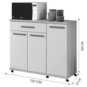 Ideal para ser utilizado como complemento da cozinha, compacto, com amplo espaço interno. o Balcão Parati vai proporcionar praticidade e funcionalidade a sua cozinha. Com suas 03 portas e ampla gaveta ele ajudará a manter sua cozinha sempre bonita e organizada. Além disso ele conta com rodízios para facilitar a locomoção.\nEspecificações do Produto Montado: Altura: 88 cm Largura: 107 cm Profundidade: 39 cm Peso: 38Kg\nGarantia: 3 meses Material da estrutura: MDF 18mm Acabamento: Pintura U.V. Número de Portas: 03 Número de Gavetas: 01 Número de Prateleiras: 02 Rodizio incluso: Sim.\nObservações: Não oferecemos serviço de montagem, mas todos os produtos possuem manual de montagem com o passo a passo. Recomendamos contratar um profissional de montagem. Pode existir alguma diferença de tonalidade entre a foto e o produto, devido ao tratamento de imagens e à calibração de cores do monitor.