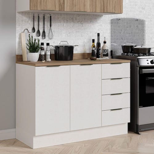Balcão de Pia Com Tampo Com Rodapé Puxador 150mm Ipanema é um móvel com design moderno e elegante, ideal para compor a decoração da sua cozinha. As portas, frentes de gaveta, tampo e caixaria são fabricadas em MDP e possuem acabamento em BP, materiais de alta qualidade e resistência, proporcionando durabilidade e praticidade no uso diário. O tampo com padrão Acácia, mais as portas e frentes de gaveta em Branco conferem sofisticação ao móvel, enquanto o rodapé Branco e o puxador de 150mm adicionam um toque de elegância ao design. Já as dobradiças com amortecimento e as corrediças telescópicas garantem um fechamento suave e silencioso das portas e frentes de gaveta, oferecendo maior resistência e praticidade. A fita de borda em PVC e o rodapé plástico trazem maior proteção contra umidade e prolongam a vida útil do móvel, além de ser fácil de limpar. Outra característica interessante deste armário é a montagem flexível, que permite escolher a opção direita ou esquerda, adaptando-se melhor ao espaço disponível da sua cozinha. Uma opção prática e funcional para quem busca organização e estilo em sua casa. Suporta Granito: Sim Acabamento da Prateleira: BP Melamínico Escala de Brilho da Prateleira: Fosco Acabamento da Gaveta: BP Melamínico Escala de Brilho da Gaveta: Fosco Material do Puxador da Gaveta: Alumínio Acabamento da Porta: BP Melamínico Escala de Brilho da Porta: Fosco Material do Puxador da Porta: Alumínio Acabamento: BP Melamínico Acabamento dos Pés: Liso Acompanha Tampo: Sim Altura dos Pés: 16 cm Ambiente Principal: Cozinha Balcão Acompanha Pia: Não Complexidade da Montagem: Média: pode ser montado por mais de uma pessoa e/ou necessite de maior conhecimento para montagem Cor: Branco Cor do Pés: Cinza Cor do Produto: Branco Cor Interna: Branco Escala de Brilho: Fosco Gaveta com Chave: Não Informações Complementares: Altura dos pés 13 cm. fechado e 16 cm. aberto Itens Inclusos: 1 Balcão de Pia, Tampo, Rodapés, Manual de Montagem e Kit Ferragens Linha ou Coleção: Ipanema Manual de Montagem e Instalação: https://cdn2.madeiramadeira.com.br/atributo/completa-moveis/1287325-ipn05a-manualdemontagem.pdf Material da Dobradiça/Corrediça da Porta: Metálica Material da Gaveta: MDP Material da Porta: MDP Material da Prateleira: MDP Material do Tampo: MDP Material dos Pés: Plástico Medida do Tampo (L x C x E): 120cmx52cmx9,5cm Montagem Flex: Sim, opção de montagem direita ou esquerda. Necessita Montagem: Sim Origem do Produto: Nacional Pés Reguláveis: Sim Peso: 54,06 kg Peso Máximo por Gaveta: 5 kg Peso Máximo por Prateleira: 5 kg Possui Pés: 06 Possui Portas: 02 Possui recorte para Cooktop: Não Recomendações de Uso, Manutenção e Limpeza: Use um pano levemente umedecido com água, seguido de pano seco. Não utilize produtos químicos ou abrasivos. Sapatas Niveladoras: Não Sistema de Montagem: Sistema de montagem via cavilhas, parafusos, minifix e pregos. Suporta Até (kg): 27 kg Tipo de Corrediça da Gaveta: Telescópica Tipo de Dobradiça/Corrediça da Porta: Soft close Tipo de Porta: Bater Tipo de Puxador da Gaveta: Externo Tipo de Puxador da Porta: Externo