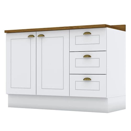 Balcão Pia 2 Portas E 3 Gavetas 120cm Americana Branco Com Tampo Nature - Móveis Henn Branco/nature Balcão Pia 2 Portas e 3 Gavetas 120cm Americana com Tampo - Móveis Henn O Balcão Pia Americana é ideal para você que busca um ambiente com estilo e beleza contemporânea, conta com amplo espaço interno auxiliando na organização da sua cozinha. O Balcão Pia faz parte da linha de cozinha modulada Americana da Henn com mais de 15 módulos que possibilitam criar o projeto de cozinha dos seus sonhos. ESPECIFICAÇÕES: - Estrutura em 100% MDF - Pintura UV fosca - 2 Portas - Dobradiças de 35mm com amortecimento - 3 Gavetas - Corrediças telescópicas - Puxadores em zamac ouro velho - Usinagem em baixo relevo - Acompanha tampo