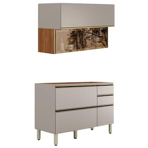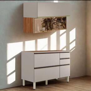 Sofisticado e funcional, o Conjunto Balcão e Armário Proença foi pensado para otimizar o espaço com elegância. Produzidos 100% em MDF (15 mm) com acabamento em pintura UV. Conta com portas basculantes com pistão a gás e dobradiças metálicas de 35 mm (sendo uma com vidro Reflecta de 3 mm), gavetas laterais (uma com divisor de talheres) e gavetão inferior, equipadas com corrediças telescópicas, pés com regulagem de altura e puxadores em alumínio. PIA/TAMPO, NÃO INCLUSO. Este produto será entregue em 03 volumes.