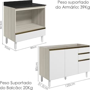 Peso Suportado do Balcão 120 cm: 20Kg (12Kg gavetas e 8Kg prateleira)