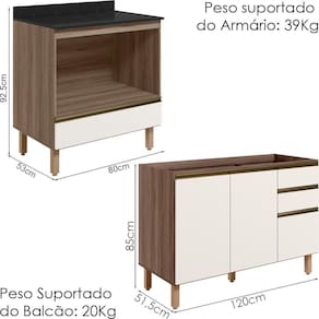 Peso Suportado do Balcão 120 cm: 20Kg (12Kg gavetas e 8Kg prateleira)