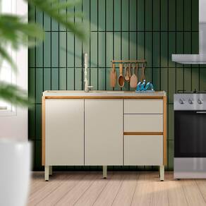 Um balcão de 120 cm feito completamente em MDF com acabamento em PVC, oferecendo gavetas com corrediças telescópicas e porta com dobradiças amortecidas, combinando durabilidade, funcionalidade e um fechamento suave para a cozinha.