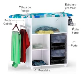 Dimensões da Tábua de Passar com Armário: - Produzida em MDP; - Pintura UV; - 1 porta com dobradiças metálicas; - Prateleira; - Passadeira revestida com tecido e espuma; - Porta Cabide; - Porta Ferro; - Puxadores de plástico resistentes; - 1 Nicho; - Não acompanha objetos de decoração;