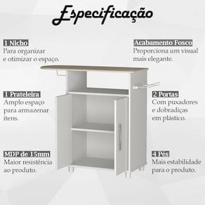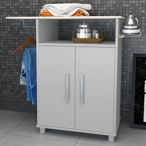 Balcão Tábua De Passar 2 Portas B04, ideal para quem busca estilo e funcionalidade. Estrutura produzida em MDP de 15mm, contando com acabamento Fosco, proporcionando maior durabilidade e resistência a peça. Composto por 2 Portas com puxadores e dobradiças em plástico, 1 Nicho, 1 Prateleira interna com amplo espaço para armazenar itens e 4 pés em plástico. Suportando até 15kg o tampo, 5kg a prateleira e 5kg o nicho. Perfeita para sua área de serviço, proporcionando praticidade no dia a dia. Este móvel chegará na sua casa em 1 volume.