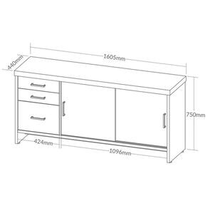 Tampo em Tamburato 50mm com fita de borda PVC com 1mm de espessura; Laterais em MDP 25mm com fita de borda PVC com 0,45mm de espessura; Portas e frente de gavetas em MDP 18mm com fita de borda PVC com 1mm de espessura; Portas de correr com perfil em PS; Gavetas com trilho telescópico; Puxadores de metal cromado; Chave na parte interna para travamento de todas as gavetas; Uma prateleira fixa, sem divisão interna entre as portas; Sapatas plásticas com regulagem de altura; Fixação com tambor, parafuso e minifix; Capacidade de Carga: 30kg distribuídos.