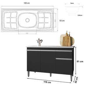 Dimensões do Balcão: Altura: 81 cm Largura: 118 cm Profundidade: 50 cm Dimensões da Pia e Cuba: Altura: 13,5 cm Largura: 120 cm Profundidade: 53 cm