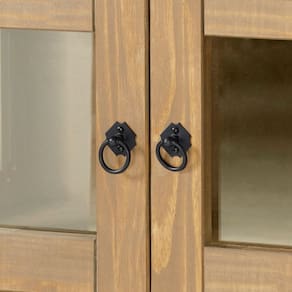 - Puxadores e dobradiças em metal preto.