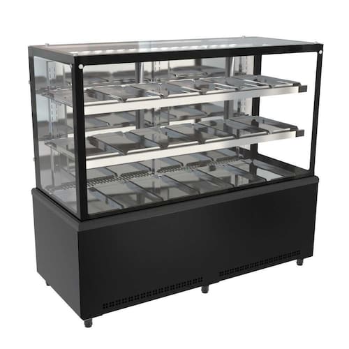 - Equipamentos destinados à conservação e exposição de salgados; - Sistema de aquecimento por resistência elétrica; - Termostato mecânico, com temperatura máxima de 60 C; - Isolamento térmico em poliuretano injetado, com densidade média de 40 kg/m; - Possui 2 níveis de prateleira de vidro; - Revestimento interno em aço inoxidável 430; - Revestimento externo em aço pré-pintado de preto; - Recipiente interno para água, para evitar o ressecamento dos alimentos; - Iluminação LED superior na cor branca em todos os níveis de prateleiras, com interruptor; - Vidros temperados; - Pés plásticos com regulagem de altura.