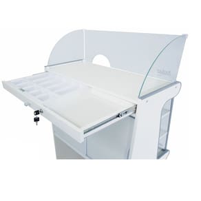 KIT 2 PEÇAS BALCÃO VITRINE 1,20 METRO E CAIXA 070 SECO EXPOSITOR MADEIRA (MDF) ATENDIMENTO BRANCO FAIXA AMARELO