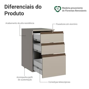 O Balcão Gaveteiro com três gavetas espaçosas oferece ótimo espaço para manter tudo sempre à mão. O destaque fica por conta da última gaveta, que possui maior profundidade, ideal para acomodar itens mais volumosos. As corrediças com abertura total garantem fácil acesso e deslizamento suave em todas as gavetas, proporcionando mais funcionalidade no dia a dia.