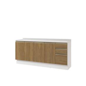 Com amplo espaço, são três gavetas e muitas prateleiras, permitindo organizar louças e mantimentos. O destaque fica para as corrediças telescópicas nas gavetas, que permitem a abertura total, e as dobradiças com amortecimento nas portas, para um fechamento suave e sem ruído. Para um melhor acabamento, os balcões contam com rodapé, mas acompanham as ferragens para serem montados suspensos, garantindo muita praticidade.