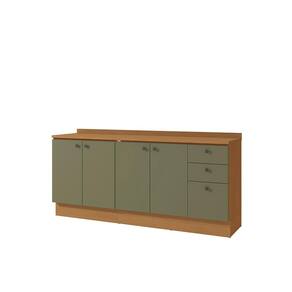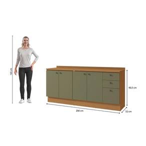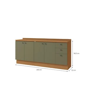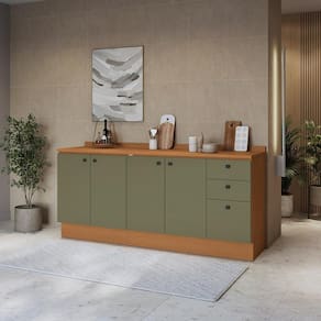 Já as frentes, na cor verde frevo, contam com acabamento fosco em BP, proporcionando maior durablidade contra riscos, arranhões e gotas d'água. Uma combinação aconchegante e moderna, remetendo aos tons da natureza e deixando seu ambiente lindo, incluindo facilidade durante a limpeza. Compacto e funcional, ideal para quem busca opções minimalistas, o combo conta com 90,5cm de altura, 2m de largura e 52cm de profundidade, composto apenas por balcões, unindo o balcão de pia ao balcão de 80cm em uma composição versátil e funcional.