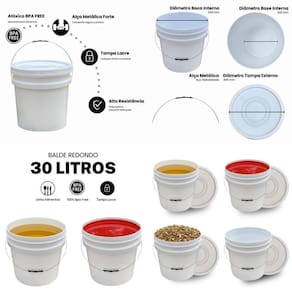 Balde 30 litros com tampa lacre de vedação e alça metálica kit 5 peças Comercializamos apenas o balde vazio. As fotos usadas do anúncio e títulos servem apenas para demonstrar suas usabilidades O balde plástico 30 litros com tampa lacre de vedação e alça metálica jaguar é ideal para o armazenamento seguro de alimentos e ingredientes. Fabricado em polipropileno copolímero virgem, é um produto atóxico, livre de bpa e próprio para contato direto com alimentos, garantindo máxima segurança, higiene e durabilidade. Seu fechamento com tampa lacre oferece vedação hermética, evitando vazamentos, entrada de ar e contaminações. Essa característica o torna perfeito para uso em cozinhas industriais, lanchonetes, restaurantes, padarias, confeitarias, laticínios e empresas do ramo alimentício que necessitam de embalagens invioláveis e de fácil higienização. O balde jaguar de 30 litros é amplamente utilizado para armazenar caldos, molhos, grãos, massas, farinhas, condimentos, frutas picadas, queijos, leite, iogurtes e outros alimentos que precisam de conservação segura. A tampa garante vedação total, mantendo a qualidade, a textura e o sabor dos produtos por mais tempo. A estrutura do balde é reforçada e resistente a impactos, permitindo empilhamento seguro e transporte fácil. A alça metálica galvanizada oferece firmeza e estabilidade, suportando cargas de até 39 kg. O acabamento liso do corpo facilita a higienização e evita o acúmulo de resíduos, atendendo aos padrões de boas práticas de fabricação. Especificações aproximadas Capacidade real: 31,2 litros Altura: entre 380 mm e 384 mm Diâmetro da base: cerca de 320 mm Peso total: de 1.278 g a 1.562 g Material: polipropileno copolímero virgem pp Alça metálica: galvanizada com alta resistência Empilhamento máximo em repouso: 2 unidades O balde jaguar é reutilizável, reciclável e fabricado com matéria-prima de alta qualidade, dentro de rigorosos padrões de segurança alimentar. Possui durabilidade estendida, podendo ser utilizado várias vezes sem deformação. Ideal para negócios que exigem higiene e controle de qualidade, o balde branco 30 litros com tampa lacre jaguar oferece a combinação perfeita entre praticidade, proteção e confiabilidade. É amplamente por distribuidores de alimentos, cozinhas industriais, produtores caseiros, panificadoras e indústrias alimentícias que buscam embalagens seguras e higiênicas. Balde para alimentos, balde atóxico, balde bpa free, balde 30 litros, balde branco, balde com tampa lacre, balde com tampa de vedação, balde com alça metálica, balde para cozinha industrial, balde para laticínios, balde para padaria, balde para confeitaria, balde para restaurante, balde plástico alimentício, balde com tampa segura, balde com lacre inviolável, balde para ingredientes, balde para massas, balde para líquidos alimentares, balde jaguar 30 litros, balde alimentício , balde plástico com tampa e vedação total.
