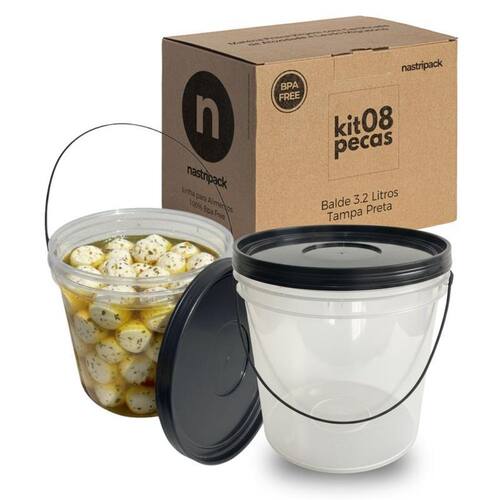 Balde 3,2l transparente com tampa preta e alça preta - kit 08 peças . Linha alimenticia: indicado para ou residencial Nesta compra você vai receber: 08 x baldes vazios 3.2 litros transparente com alça preta 08 x tampas pretas com lacre de vedação Capacidade e medidas técnicas Volume real: 3,2 litros Diâmetro superior: 180,50 mm a 184,50 mm Diâmetro inferior: 151,00 mm a 155,00 mm Altura externa: 171,00 mm a 175,00 mm Espessura das paredes: 0,75 mm a 0,95 mm Peso do corpo: 92,50 g a 94,50 g Peso da alça: 3,0 g a 3,5 g Material: polipropileno pp atóxico e livre de bpa Esses dados técnicos asseguram que o balde para alimentos da nastripack atende aos mais rigorosos padrões de qualidade. O balde 3,2 litros transparente com tampa preta da nastripack é a solução ideal para empresas e consumidores que buscam um recipiente versátil, resistente e seguro para armazenar alimentos, ingredientes ou produtos diversos. Fabricado em polipropileno pp de alta qualidade, este balde para alimentos atende às mais exigentes normas de higiene e segurança alimentar. Com um design moderno, transparente e funcional, ele oferece praticidade no manuseio e confiança no armazenamento, destacando-se como um dos produtos mais completos do portfólio nastripack. Design transparente para visualização rápida: O corpo do balde 3,2 litros transparente com tampa preta foi desenvolvido para permitir a visualização total do conteúdo interno. Isso facilita o controle de , o acompanhamento de validade de produtos e a identificação imediata dos alimentos armazenados. Essa característica é essencial para cozinhas industriais, restaurantes, lanchonetes, confeitarias e empresas que precisam de organização e agilidade. Tampa preta com fechamento seguro: A tampa preta possui encaixe preciso e tecnologia de lacre, garantindo vedação hermética e proteção contra vazamentos ou contaminações. O balde com tampa preta da nastripack é ideal para armazenar líquidos, cremes, massas ou produtos sólidos, mantendo frescor, sabor e textura dos alimentos. Além disso, a tampa preta facilita a diferenciação de lotes ou categorias de produtos. Alça preta resistente e ergonômica: Para facilitar o transporte, o balde 3,2 litros transparente com tampa preta acompanha alça preta em polipropileno altamente resistente. A alça é confortável, ergonômica e oferece firmeza ao carregar produtos pesados. Isso transforma o balde com alça preta em um aliado no dia a dia de negócios alimentícios, laboratórios, cosméticos ou indústrias químicas que necessitam de recipientes práticos. Material de alta qualidade: polipropileno pp O balde 3,2 litros transparente com tampa preta é fabricado em polipropileno pp , um dos materiais plásticos mais seguros para contato com alimentos. É resistente a impactos, temperaturas variadas e à ação de substâncias químicas leves. Além disso, é 100% reciclável, reforçando o compromisso da nastripack com a sustentabilidade. Aplicações versáteis: O balde para alimentos de 3,2 litros pode ser utilizado em uma ampla variedade de aplicações: Armazenamento de produtos alimentícios molhos, cremes, grãos, farináceos, pastas, temperos ; Setor cosmético e farmacêutico cremes, pomadas, suplementos ; Indústrias químicas e de limpeza produtos concentrados, amostras, compostos líquidos ; Uso doméstico organização de despensa, freezer ou geladeira ; Transportes de pequenos volumes de líquidos ou sólidos com segurança. Essa versatilidade torna o balde 3,2 litros transparente com tampa preta um item indispensável para quem procura praticidade e qualidade. Vantagens do balde 3,2 litros transparente com tampa preta Transparência para identificar o conteúdo sem abrir; Tampa preta com fechamento seguro e lacre; Alça preta ergonômica para transporte confortável; Material atóxico e livre de bpa; Design resistente, leve e empilhável; Fabricado pela nastripack, referência em qualidade e inovação. Diferenciais da nastripack.