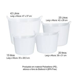 Balde ideal para lavanderia, cozinha, jardinagem e brinquedos. Cesto com alça anatomica, forte e duravel. Facil de transportar, nao machuca as maos, empilhavel e facil de guardar. Os cestos organizadores sao flexiveis e versateis. Produzido em material atoxico e livre de Bisfenol A (BPA Free). Contem: 1 cesto de 42 litros Dimensoes: 47 x 37 cm 1 cesto de 25 litros Dimensoes: 42 x 28 cm 1 cesto de 20 litros Dimensoes: 38 x 31 cm 1 cesto de 15 litros Dimensoes: 35 x 28,5 cm Material: Polietileno PE