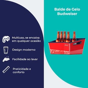 O Balde segue o design da marca Budweiser garantem um toque e sofisticação, tornando-o um produto funcional e decorativo.