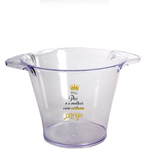 Balde De Gelo Personalizado Dia Dos Pais Tema Cerveja O Balde de Gelo de 5 Litros com espaço para em média 3 Cervejas tem possibilidade de personalização com o nome da sua festa ou marca, não existe melhor bebida para celebrar com o seu pai do que cerveja, sempre geladinha no seu balde personalizado. Não deixe de comemorar essa data tão especial com o seu pai junto com o balde de gelo KrystalON. Características: Material: Poliestireno Acrílico PS , Altura: 20 cm, Diâmetro: 23 cm, Capacidade: 5 Litros, Cor: Transparente