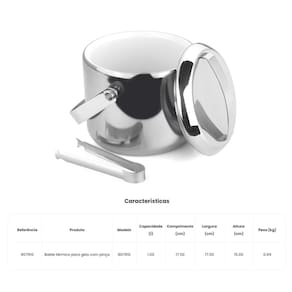 Com o Balde de Gelo Térmico suas bebidas estarão sempre na temperatura ideal e ao alcance das suas mãos. A tampa e o recipiente interno do produto garantem a conservação das pedras de gelo por muito mais tempo e a pinça evita que você molhe as mãos. Feito em aço inox, o porta gelos é resistente e não apresenta porosidades, o que evita o acúmulo de resíduos e facilita a limpeza.