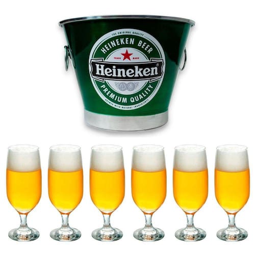 Cjto balde de gelo heineken aluminio com abas laterais 6L + taças floripa cerveja 300mlIdeal para sua mesa de bar,conservar bebida gelada Medidas: 25x16Peso:950g