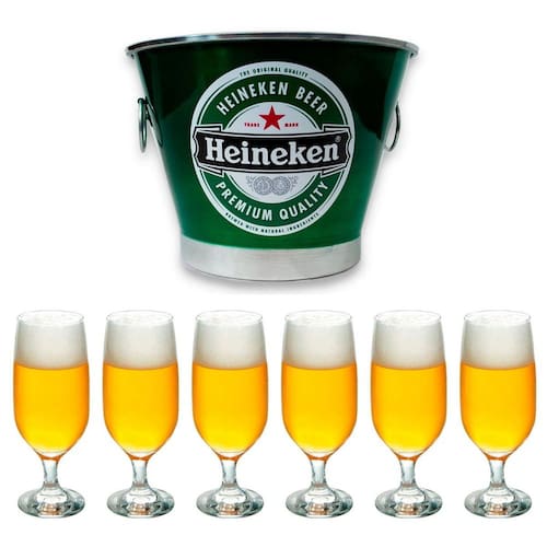 Cjto balde de gelo heineken aluminio com abas laterais 6L + taças floripa cerveja 300ml Ideal para sua mesa de bar,conservar bebida gelada Medidas: 25x16 Peso:950g Ean: 7898964892181