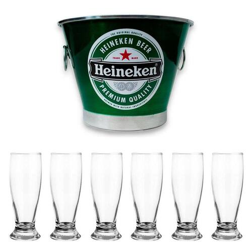 Cjto balde de gelo heineken com abas laterais + copos munich cerveja 300ml Ideal para sua mesa de bar,conservar bebida gelada Medidas: 25x18 Peso: 950g