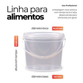 Balde transparente 2.2 litros com tampa lacre de segurança 100% bpa free - 5 peças Comercializamos o balde vazio e sem impressão O titulo e o rótulo serve apenas como sugestão de usabilidade Setor alimentício, químico e diversos. Multiuso - embalagens com boa resistência em baixas e altas temperaturas e aprovadas para contato com alimentos. - balde plásticos rígidos desenvolvidos e fabricados especificamente para a indústria alimenticia, quimica e farmaceutica - as tampas tem ótimo fechamento e são de fácil colocação, seu desenho permite um empilhamento seguro Todos os processos são feitos em sintonia com as suas exigências, tanto de segurança, durabilidade e estética. Nesta compra voce vai receber: 05 x baldes transparentes com alça plástica com capacidade de 2.2 litros 05 x tampas plastica transparente com lacre de segurança Balde: Diâmetro interno superior 156.50 mm Diâmetro interno inferior 137 mm Diâmetro externo superior 161.40 mm Diâmetro externo inferior 140 mm Diâmetro externo máximo 166.40 mm Altura interna 136 mm Altura externa 140 mm Altura com a tampa 141.60 mm Espessura média lateral 0.75 mm Espessura média no fundo 0.80 mm Peso 71 gramas Tampa: Diâmetro externo 169 mm Altura 15.20 mm Espessura média de parede 0.75 mm Peso 23 gramas Material pp branco Alça: Comprimento: 350 mm Espessura media parede: 0,85 mm O balde branco de 2.2 litros para alimento com tampa lacre é um recipiente projetado para armazenar alimentos em grandes quantidades. Ele é fabricado em plástico resistente, pp polipropileno de alta densidade, que é seguro para o contato com alimentos. A forma redonda do balde permite que ele seja empilhado facilmente, o que economiza espaço no armazenamento. O tamanho de 2.2 litros é adequado para armazenar alimentos em grande quantidade, tornando-o uma opção popular para uso comercial em restaurantes, padarias, indústrias alimentícias, entre outros. Seu volume real abaixo da tampa é de 2.5 litros podendo chegar em 2.6 litros sem tampa até a borda do balde. A tampa lacre é uma característica importante deste balde, pois mantém o conteúdo fresco e protegido de contaminantes externos. Possui um sistema de encaixe que proporciona um fechamento seguro e hermético, impedindo a entrada de ar, poeira, insetos e outros elementos que possam prejudicar a qualidade do alimento. Além disso, o balde de 2.2 litros branco possui uma tampa com lacre de segurança que é facilmente higienizável, podendo ser lavado com água e sabão e diversas vezes. Isso o torna uma opção econômica e sustentável para o armazenamento de alimentos. Alguns dos principais benefícios do balde 2.2 litros transparente para alimento com tampa lacre incluem: - alta capacidade de armazenamento: com capacidade de 2.2 litros, este balde é ideal para armazenar grandes quantidades de alimentos. - proteção contra contaminação: a tampa com lacre de segurança é uma barreira eficaz contra insetos, poeira e outros contaminantes que possam prejudicar a qualidade do alimento. - facilidade de transporte: o balde é leve e fácil de transportar, permitindo que o alimento seja movido de um local para outro com facilidade. Fácil visibilidade devido sua tampa ser transparente. Em resumo, o balde branco de 2.2 litros para alimento com tampa lacre é um recipiente prático e seguro para o armazenamento de alimentos em grandes quantidades. Não espere mais para garantir a durabilidade e a frescura dos seus alimentos adquira agora o balde transparente 2.2l com tampa lacre e tenha mais praticidade e segurança. Nastripack,transparência,vedação,armazenamento,empilhamento.