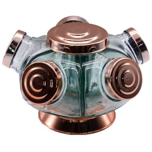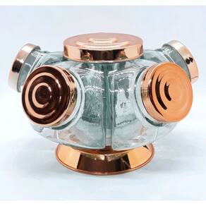 Porta Doce Baleiro Giratório Mini 5 Potes Baleiro de vidro MINI para para uso pessoal como peça de decoração devido seu estilo conservador Com visual retrô e beleza rara este produto atende a todos os tipos de consumidores ávidos por produtos diferenciados e ao mesmo imunes ao tempo. Obs: As pequenas imperfeições, tais como irregularidades na espessura, no peso ou no diâmetro e as pequenas bolhas, que às vezes se formam dentro do vidro, são a clara garantia de um produto feito artesanalmente. Ficha Técnica: Baleiro de vidro giratório mini 05 potes Boêmia 1 andar tampa plástico Vidro transparente Capacidade 250 ml por gomo - Total: 1,250 litro Tampa com rosca em plástico polido Base em plástico Cor Cobre Dimensões do MINI baleiro: Comprimento 22 cm Altura 13,5 cm Profundidade 22 cm Peso líquido 2,290 kg Marca: Não Informado