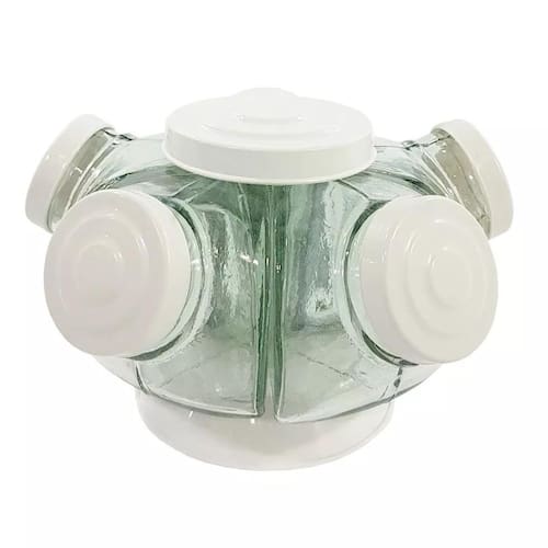 Baleiro, Bomboniere, Porta Doces Com 5 Potes 250ml De Vidro Base Giratória Bon Gourmet Cor: branca Altura: 16cm Diâmetro: 23cm Capacidade: 250ml por gomo Total: 1,250 litros Garantia: Contra defeitos de fabricação Imagens meramente ilustrativas Marca: Não Informado