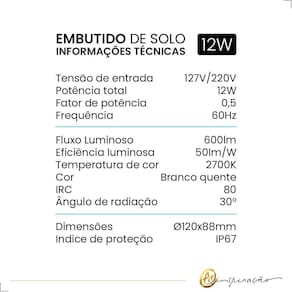 Balizador De Embutir Para Solo Piso Led 2700K 12W Externo Ip67 Tensão de entrada: 127V/220V Potência total: 12W Fator de potência: 0,5 Frequência: 60Hz Fluxo luminoso: 600lm Eficiência luminosa: 50lm/W Temperatura de cor: 2700K-Branco Quente Cor: Preto IRC:80 Angulo de radiação: 30 Dimensões: 120x77mm Ean: 7908163132367