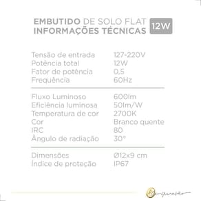 Tensão de entrada: 127-220V Potência total: 12W Fator de potência: 0,5 Frequência: 60Hz Fluxo luminoso: 600lm Eficiência luminosa: 50lm/W Temperatura de cor: 2700K Cor: Branco Quente IRC: 80 Ngulo de radiação: 30 Dimensões: 12x9 cm Índice de proteção: IP67 Marca: Não Informado
