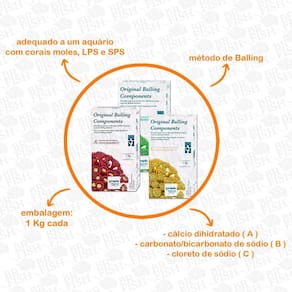 O método de 3 partes adiciona cloreto de cálcio dihidratado parte A e carbonato/bicarbonato de sódio parte B , enquanto a adição de sal marinho livre de cloreto de sódio parte C mantém o balanço iónico crucial na água do aquário. Esta dosagem equilabrada de cálcio cria as melhores condições para o bom crescimento de corais e alga coralina e evita a inevitável descida de elementos importantes vista nos métodos de duas partes. Benefícios - Permitem uma dosagem independente de cálcio e alcalinidade para compensar eventuais desequilíbrios no aquário. - Para usar o método Balling todos os três componentes são necessários: cloreto de cálcio dihidratado parte A , carbonato/bicarbonato de sódio parte B e sal marinho livre de cloreto de sódio parte C . - Todos os componentes estão disponíveis separadamente em embalagens de 1 kg. - As soluções podem ser utilizadas logo após a dissolução e podem ser conservadas durante um longo período de tempo. - Adequado a um aquário com corais moles, LPS e SPS.
